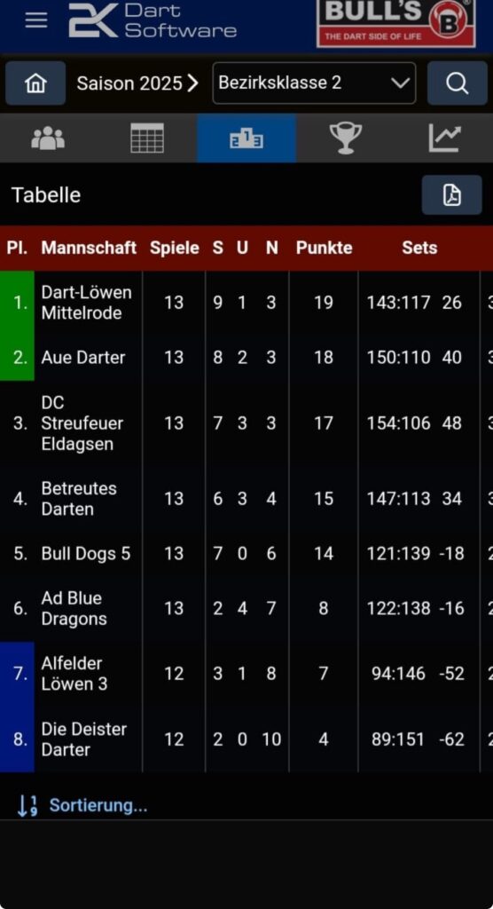 Am 10.10.2025 gewannen die Dart Löwen Mittelrode gegen die Bull Dogs aus Wunstorf in Wunstorf mit 13:7 und sind in die Bezirksliga aufgestiegen.