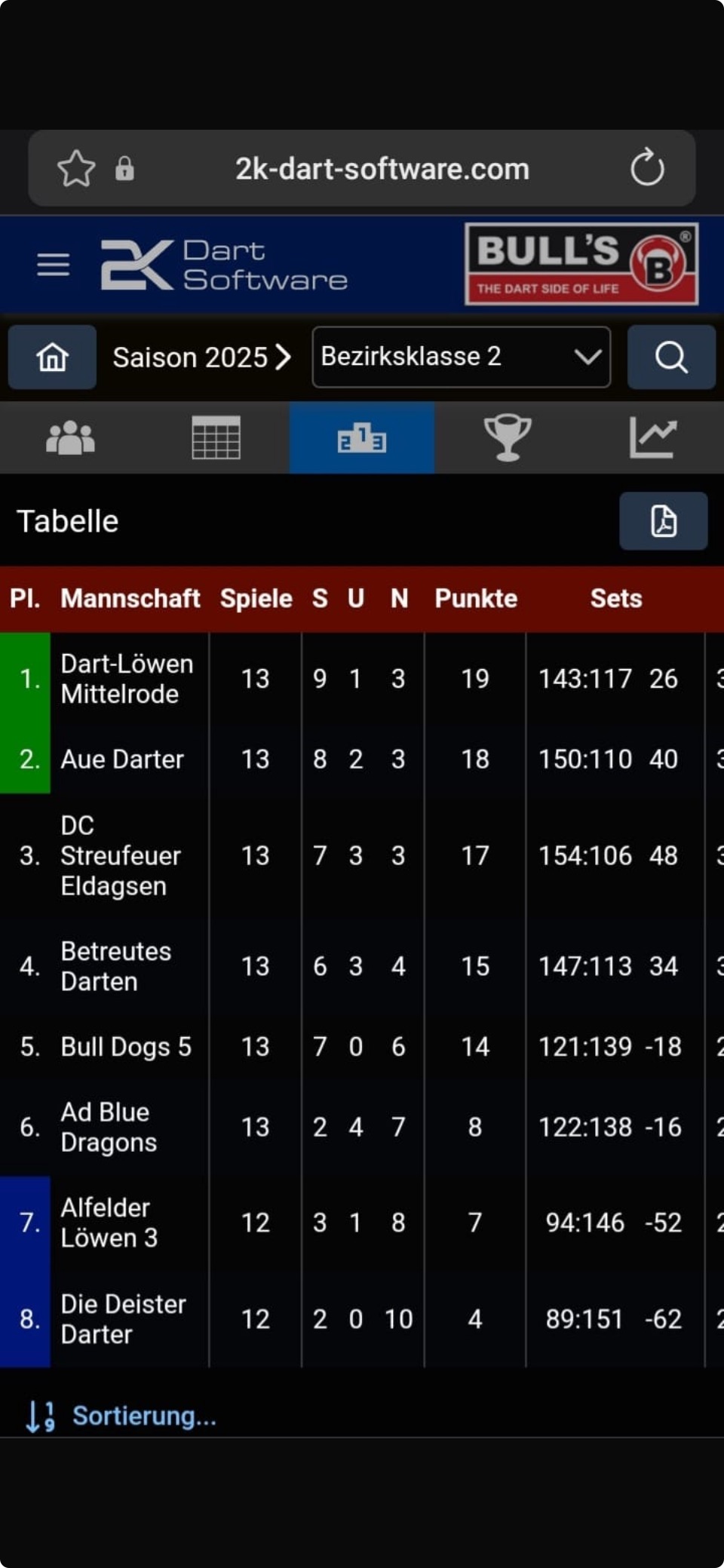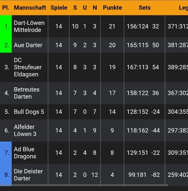Nach einem sehr erfolgreichen Spiel am letzten Samstag führen die Dartlöwen die Tabelle der 2. Bezirksklasse an!