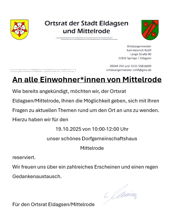 Der Ortsrat Eldagsen/Mittelrode lädt am 19.10.2025 von 10-12 Uhr ins DGH Mittelrode ein um aktuelle Fragen und Themen rund um den Ort zu besprechen und Gedanken auszutauschen.