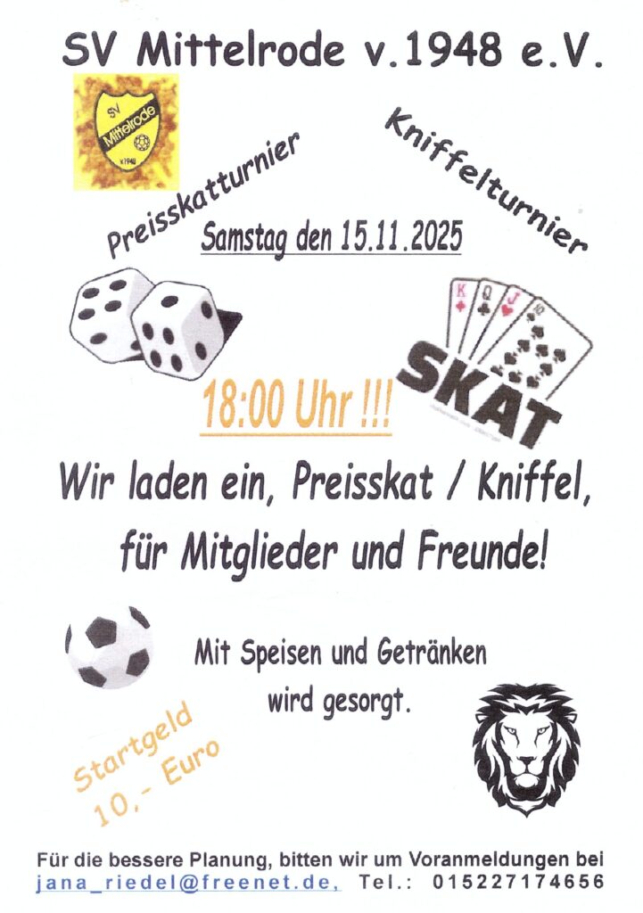 Wer uns noch mit Dauerkarten für die Saison 2025/26 für die Heimspiele der Fußballer und Dartlöwen unterstützen möchte, kann diese dann vor Ort erwerben oder meldet sich bitte bei Matthias Tscharntke (0157/6626687)
