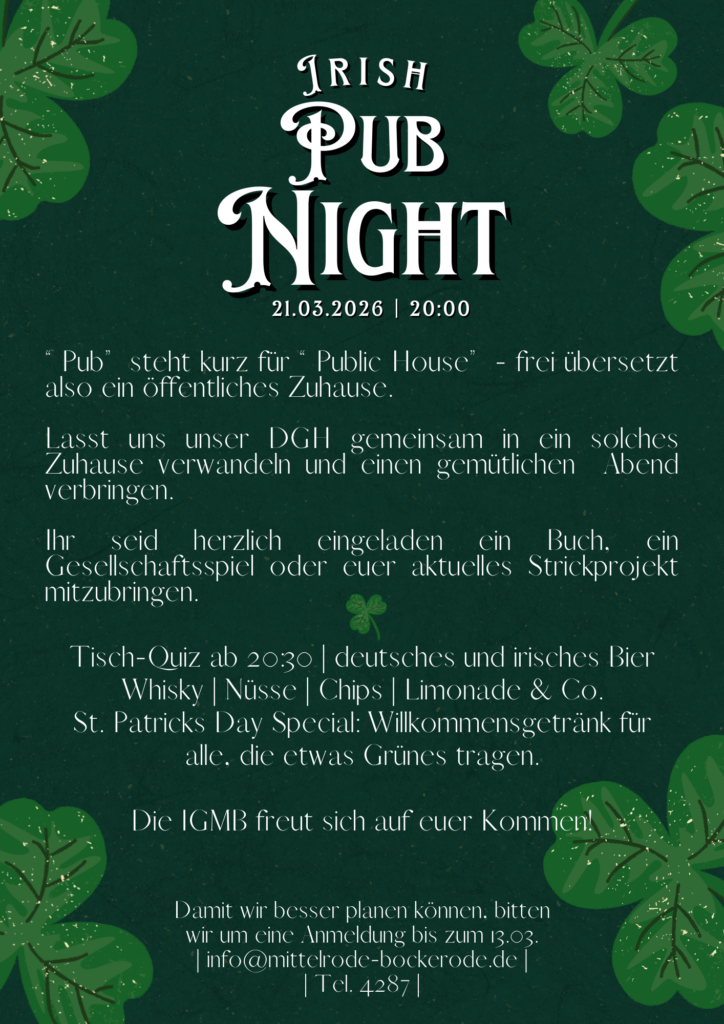 Volles Haus, super Stimmung und urige Atmosphäre: Unser Irish Pub Abend am 21.3.2026 war ein voller Erfolg. Bei Guinness, Hop House und Whiskey kam echtes Pub-Feeling auf. Dartscheibe, Knobellbecher und Mittelrodes wahrscheinlich erstem Table Quiz sorgten für jede Menge Spaß und gute Laune. Der Überschuss aus der Veranstaltung kommt der Renovierung des Transformatorenhauses und der Außenbeleuchtung des DGH zur Gute. Schön, dass ihr dabei gewesen seid!